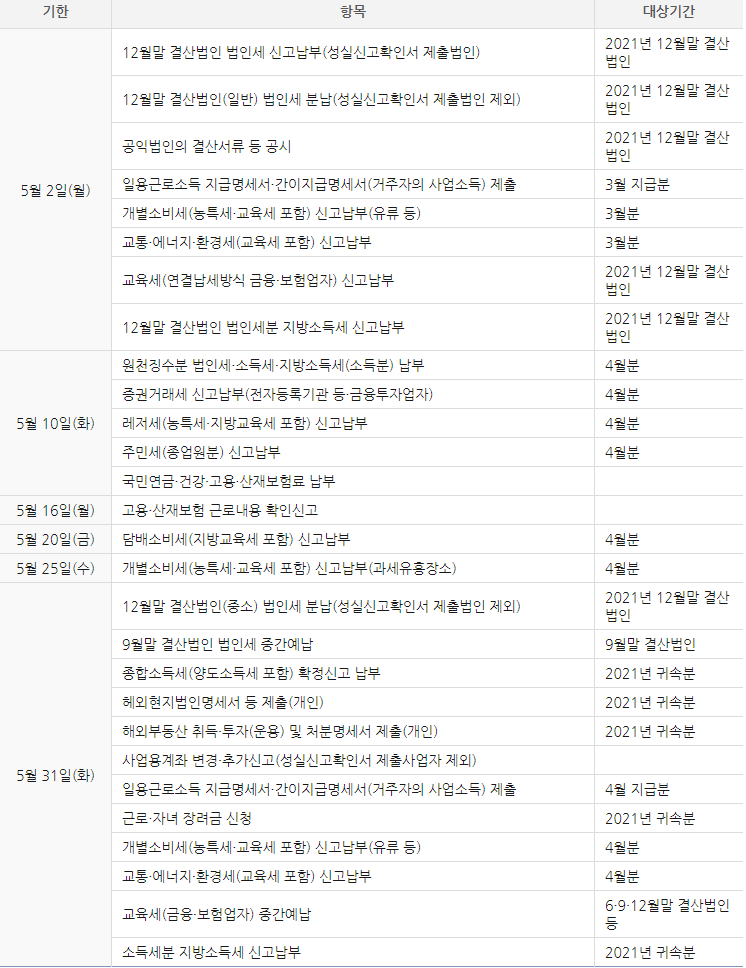 2022년 5월의 세무일정을 공유합니다.